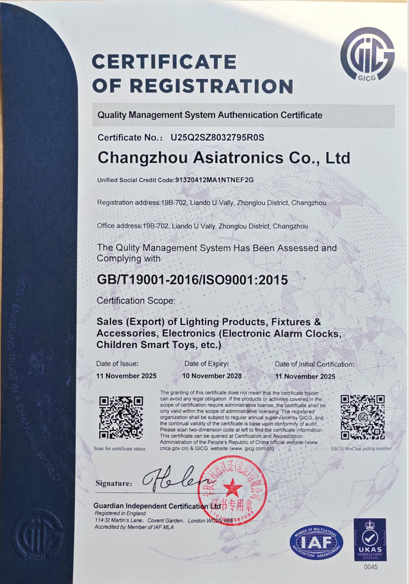 Changzhou Asiatronics Co., Ltd. has officially obtained ISO 9001:2015 Quality Management System certification. This achievement signifies that the company has established and implemented an internationally standardized quality management system, covering the entire process from product design and manufacturing to service.2025-12-04